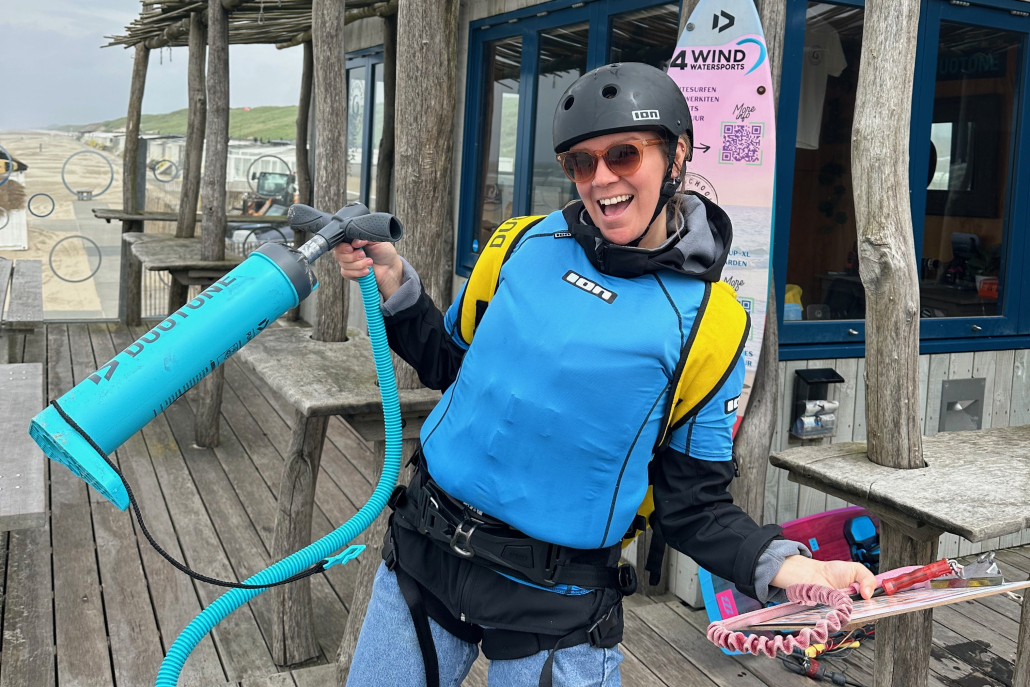 Om je kite op te pompen, gebruik je een speciale kitesurfpomp. Merken zoals Duotone bieden duurzame pompen met handige extra’s. De zogenaamde double-action pompen blazen zowel bij de op- als neerwaartse beweging, waardoor je kite sneller gevuld is.